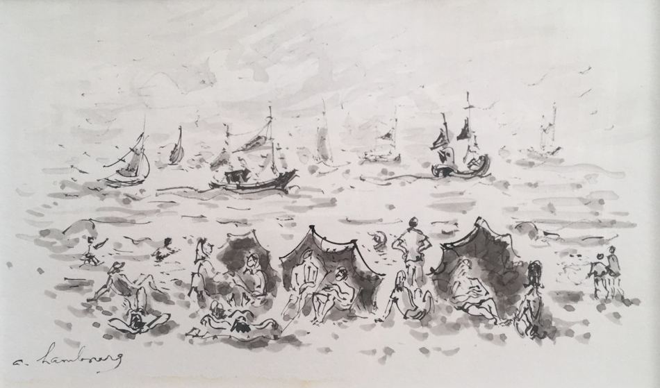 André Hambourg Scène de plage Scène de plage Encre de Chine sur papier signée en bas à gauche dimensions à vue : 15,5 x 25,5 cm